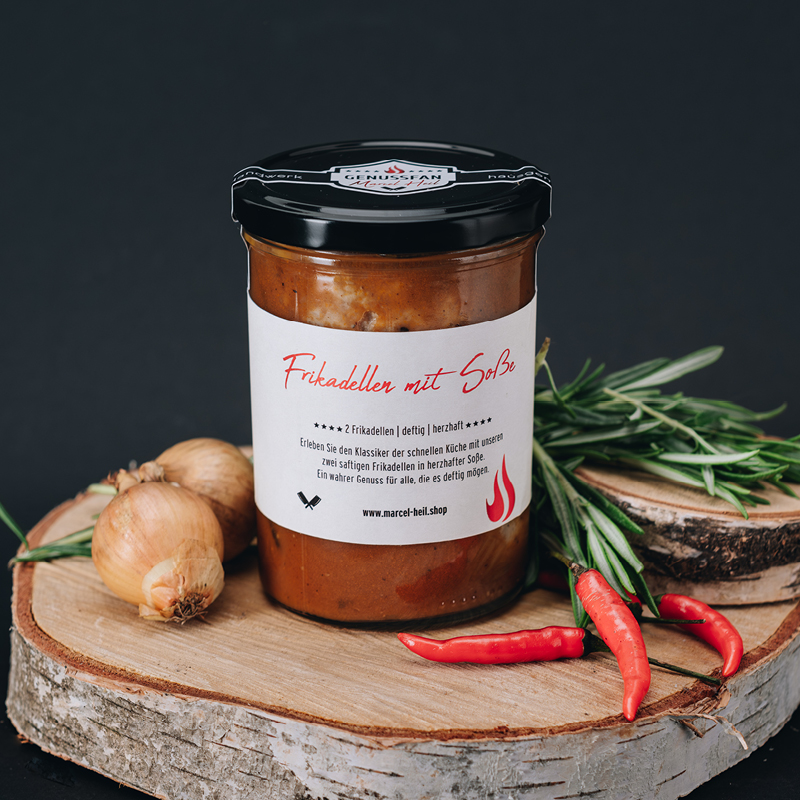 Zutaten: Frikadelle (53%): (Schweinefleisch (40%), Rindfleisch (25%), Zwiebeln, Brötchen: (Weizenmehl, Wasser, Salz, Hefe, Hartweizengrieß, Backmargarine), Ei, Speisesalz, Gewürze), Bratensoße: [Knochenbrühe (Wasser, Schweinefleisch, Lauch, Sellerie, Karotte, Speisesalz, Pfeffer), Weizenmehl, Palmöl, Farbstoff Ammoniak- Zuckercoleur]