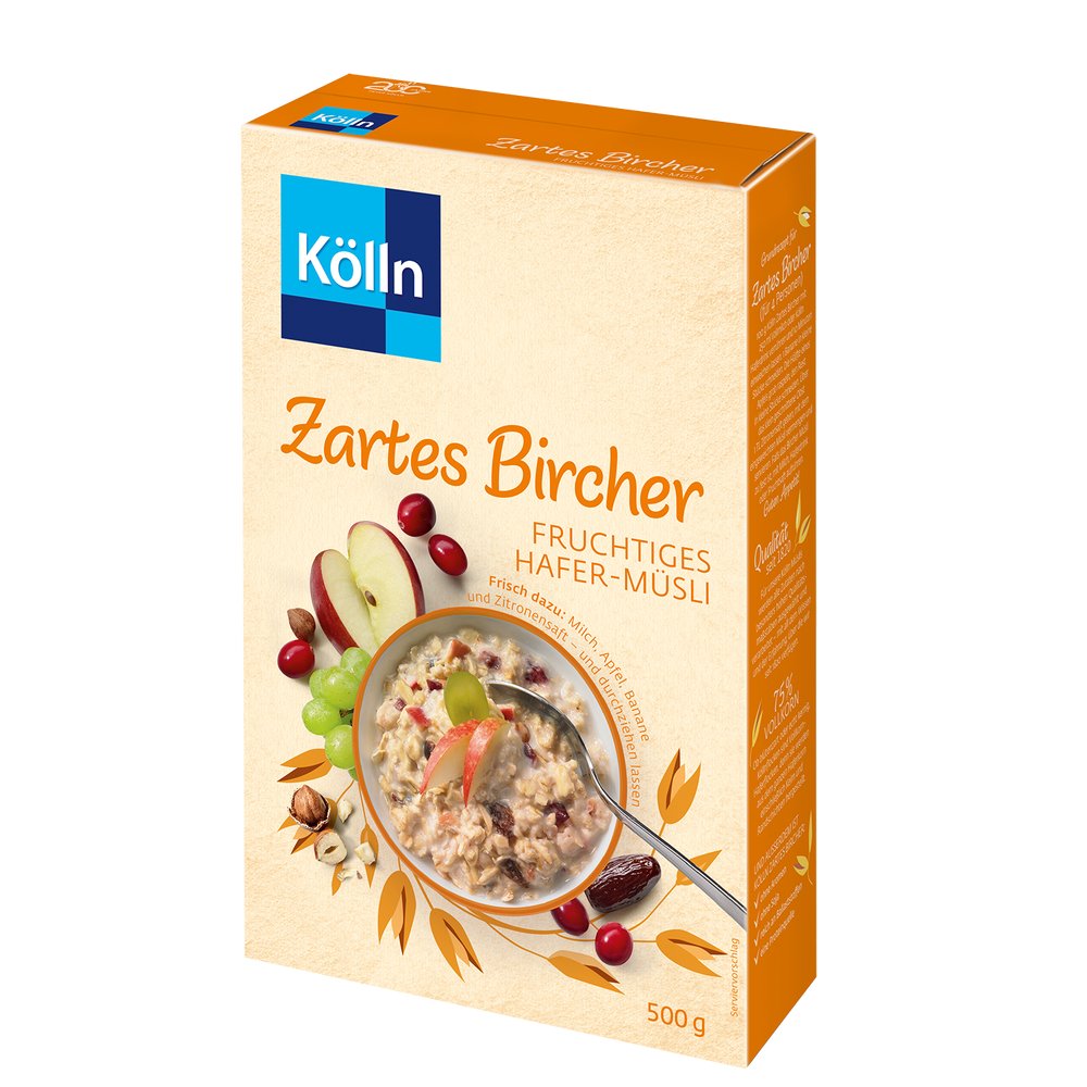 Kölln Zartes Bircher Fruchtiges Hafer-Müsli – blütenzarter Frühstücksbrei zum Verfeinern. Für Kenner ist Bircher mehr als ein Müsli es ist ein Frühstücks-Bekenntnis. Ob klassisch mit frischem Obst verfeinert, oder pur mit Milch bei unserem fruchtigen Haferbrei haben wir uns am klassischen Vorbild des Erfinders orientiert. Fein mit Honig besprüht ist dieses Bircher eine wunderbar zarte Basis für ein genussvolles Frühstückserlebnis.